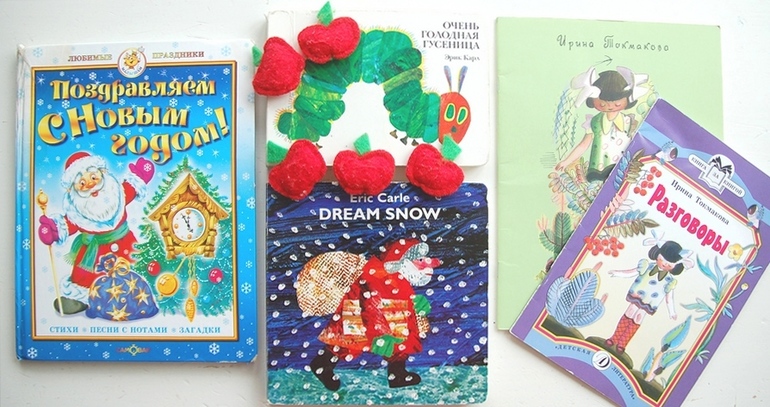 Эрик Карл "Очень голодная гусеница" и "Снежный сон" - то лежат неделю на полке, то не оторвать от рук. (Есть у нас еще "Грубиянка в крапинку", ее не смотрят) А уж список продуктов, который должен купить папа в магазине, перечисляется исключительно в соответствии с тем, что ела эта маленькая зеленая обжорка. В "Гусенице" по-прежнему больше всего нравятся дырочки и счет, а в "Снежном сне" - счет и последняя картинка, могут доооолго ее рассматривать.