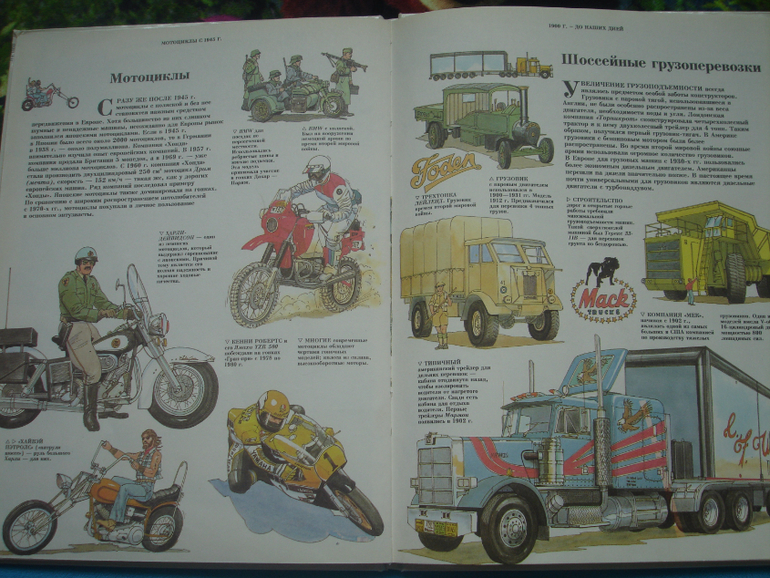 «Транспорт» - говорила про неё уже, немного покажу. СтОящая вещь, повторюсь, жалко, что давно изданная. Вот один из любимых разворотов. Саня у нас фанатеет по легковым машинам, собирает железные, чтобы были как настоящие, со знаками, по лицензии автоконцернов. Вот тут радовался, что у него такой же «Фольксваген Жук» есть. А вообще в коллекции у него только современные.