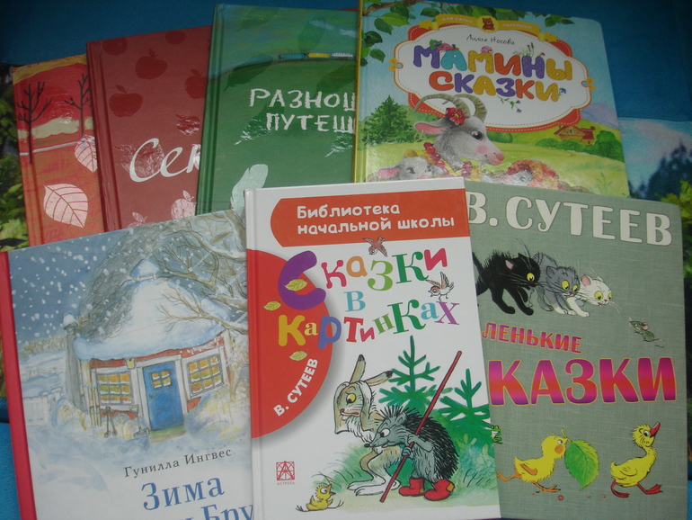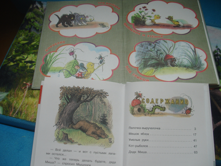 Нового здесь - одна книга Сутеева. Вспомнили совсем малышковые сказки. До сих пор нравятся. Взяли новый сборник. «Мешок яблок» знакома, поднадоела немного, «Умелые руки» Саня почему-то не особо жалует, а вот остальные понравились очень. В первый вечер прочитали каждую сказку, наверное, раза по 4 точно. В рассказе «Дядя Миша» нашла одну опечатку в самом конце. Большого сборника у нас так и нет (зная пристрастия к компактным и тоненьким книгам, почти уверена, что он у нас не пойдёт, да и не нужно нам всё-всё), так что Сутеев раскидан по разным книгам.