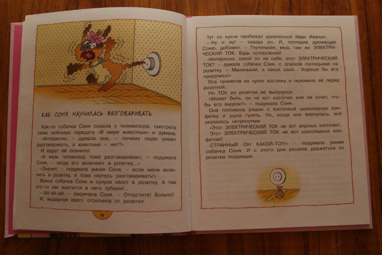 С Мишей мы сейчас очень любим читать Умную собачку Соню Андрея Усачёва. Читаем либо два небольших рассказа (на пару страниц), либо один побольше (страницы три-четыре). Миша внимательно слушает, улыбается. Я стараюсь читать с выражением и разными голосами )))) Книга эта выпущена многими издательствами. У нас книга 2016 года издательства Махаон.