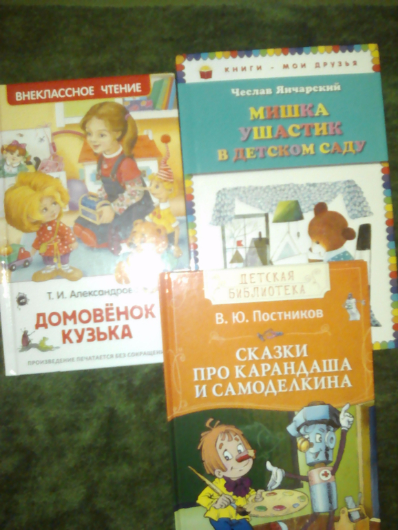 Эти книги мы только начали читать. Мишка-Ушастик первоначально очень приглянулся Еве. Домовёнок Кузька как-то тяжеловат, но Еве, кажется, тоже грозит понравиться. а вот Карандаш и Самоделкин - не для нас. Прочли только одну историю, два раз, так как она про дорожные знаки, к которым у Евы как раз был бАААльшой интерес.
