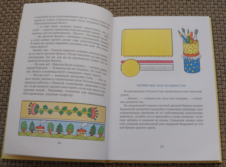 Уроки занимательного труда брала специально для старшей дочки - она у меня любит что-нибудь мастерить. Читали они с бабушкой на больничном - бабуля была в восторге, и дочка тоже.)) Бабушка даже побежала поскорей за картоном и цветной бумагой в книжныйхотя дома все забито этим добром...Добротная книга, сказочная история с уроками по изготовлению несложных поделок и даже домашнего театра.
