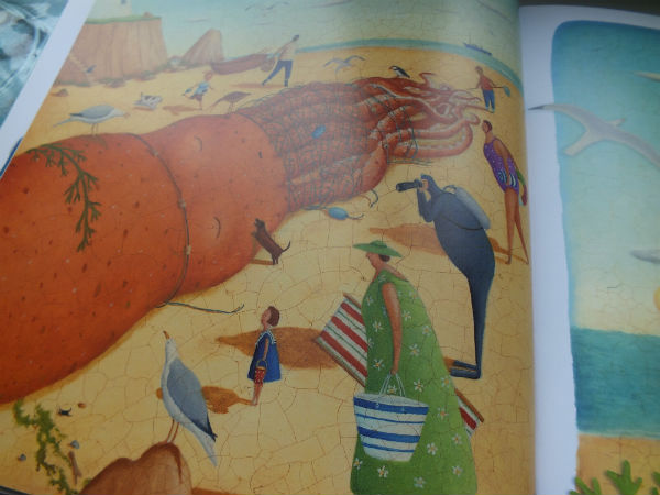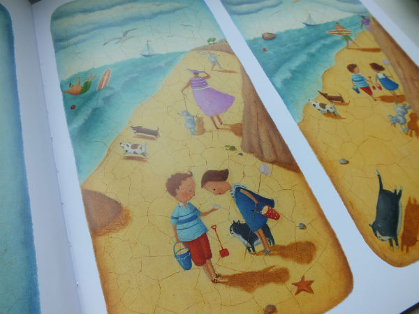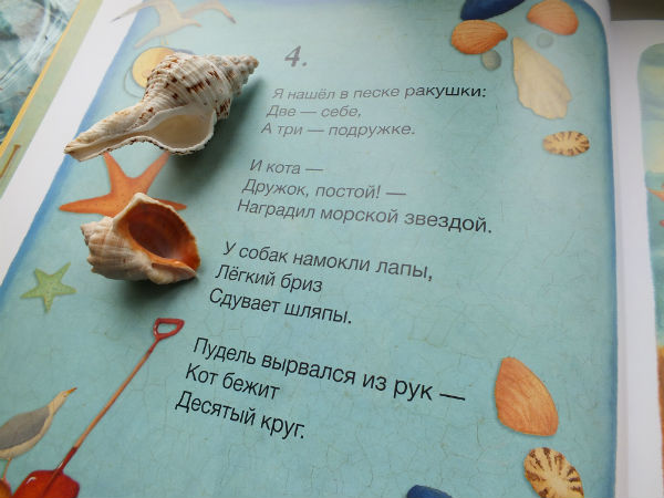 Ребенок сразу кричит: "Мама, это же слушай, слушай! Читай скорее!". Начинаем читать. Нужно сказать, что переводил Михаил Яснов, стихотворение чудесное получилось. И еще в отличие от "Слушай, слушай" у стихотворения есть сюжет. В принципе это стихотворение о том, что можно делать на пляже, за чем можно наблюдать в прибрежной полосе и т.д.