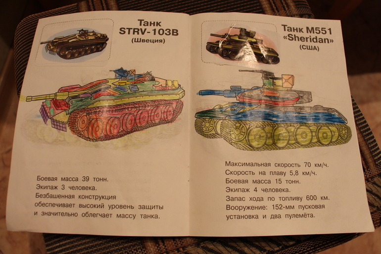 Ой, технические характеристики я скоро выучу наизусть. У нас в наборе с каждым танком листочек и Егор каждый раз приносит и просит прочитать сколько длина, ширина и вес. Иногда у него проскальзывало, что хочу на войну и я ему говорила, "на войну не надо, там погибают. Нужно в армию, чтобы Родину защищать". Теперь он все время Родину защищает. А вот танки у нас такими яркими не получаются)) только темно зеленый, серый и черный - маскировка))) его в этом не проведешь))) Нам как-то попался белый танк, так он его зеленым маркером хотел перекрасить. Пришлось объяснить, что это для маскировки зимой.