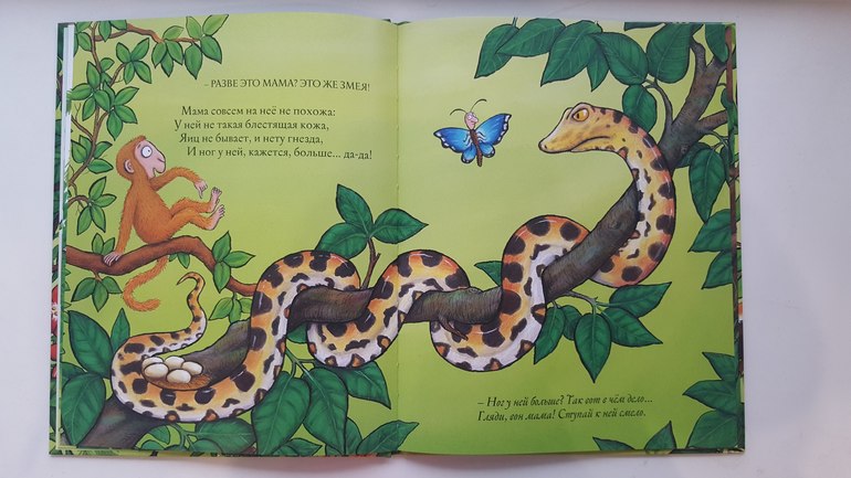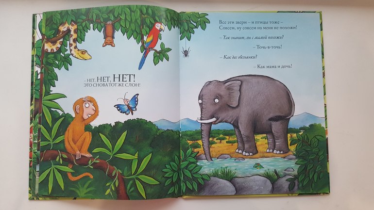 На пути им встречаются разные животные: попугай, слон, змея, лягушка, паук, летучая мышь. Но все они не похожи на маму.