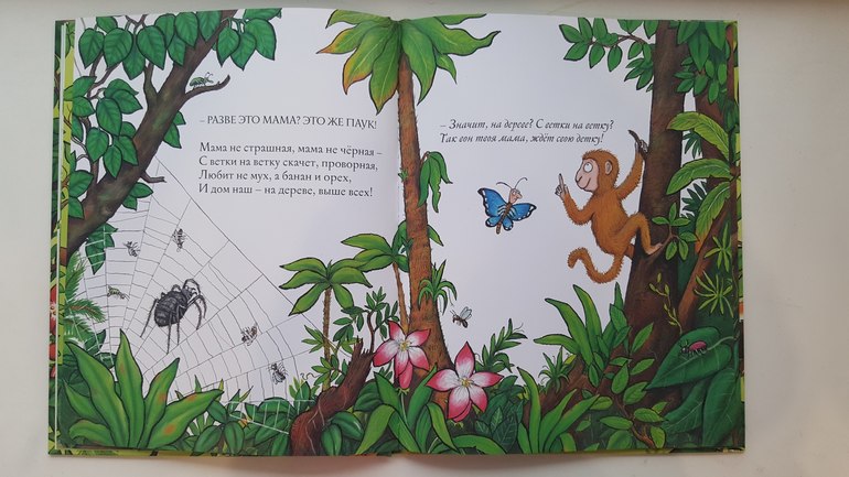 Отличная книга для чтения в кругу семьи. В ней показаны правильные ценности. А еще можно учить животных. Нюрка уже показывает, где обезьяна, слон, попугай. А я рассказываю, кто какого цвета и размера, у кого какая шкурка - мокрая, гладкая, меховая, кто ходит, ползает, летает, прыгает, кто где живёт и чем питается.