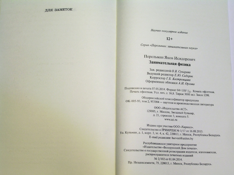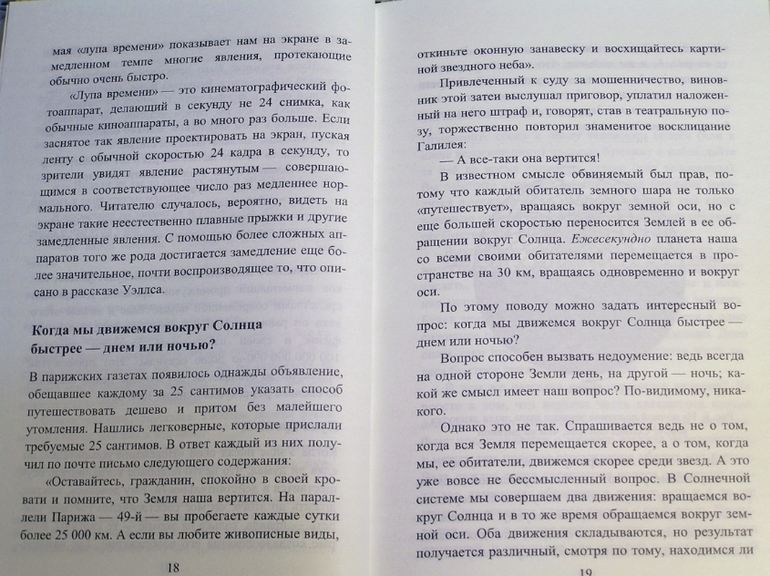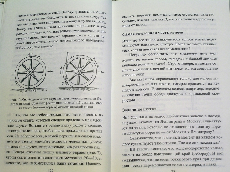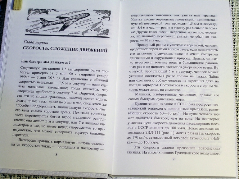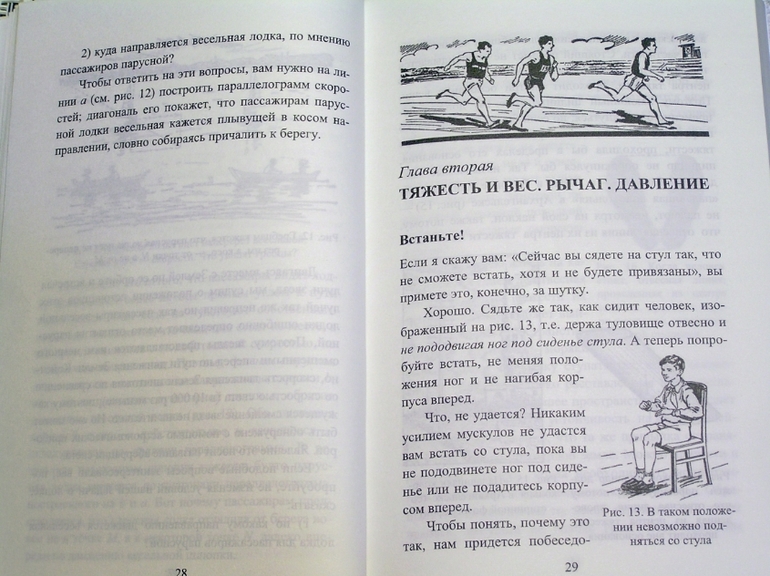 Книга из разряда прочитал - передай другому. Именно так от меня в детстве уплыла и моя книжка, в которой было при таком же формате намного меньше страниц и информации. Ко мне «Занимательная физика» попала до школы, и, прочитав с удивлением, что ходьба это ряд падений, сделала выводы. Результат выводов - мои грамоты спортивных достижений. И конечно же чтение запоем всего Уэллса, который имелся в библиотеках, фантастики доступной, грамотное лазание по яблоням и стройкам без падений, и многое другое, что мог применить в жизни ребенок. Баланс и центр тела, вкупе с умением привносить знания в жизнь, позволили мне освоить лыжи, коньки, сноуборд, велосипед с первого раза. Встала и поехала. "Как будто кто-то научил", - до сих пор говорят мои родители.