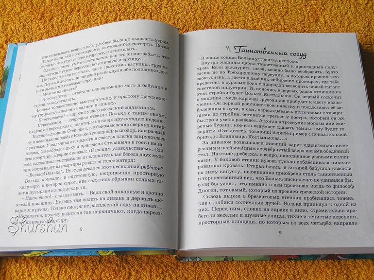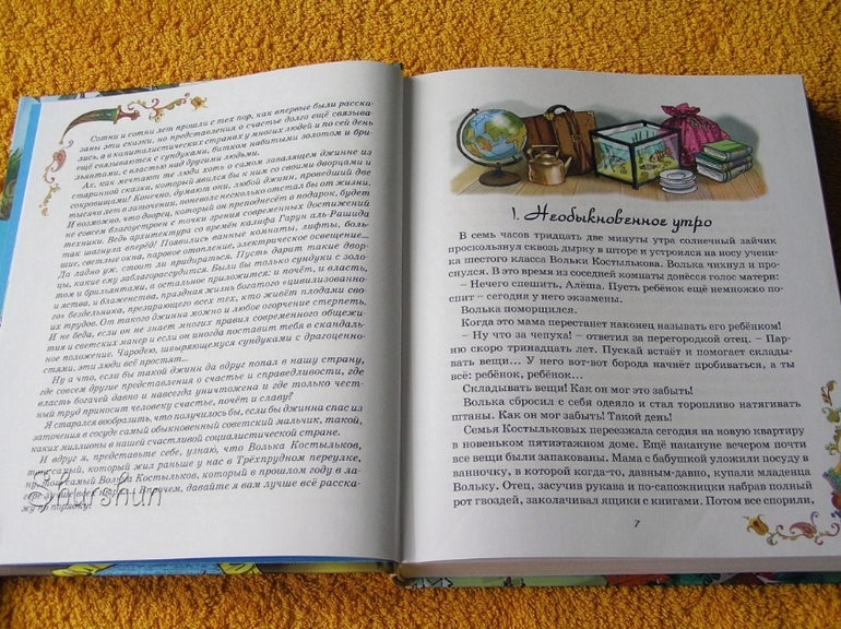 "В семь часов тридцать две минуты утра весёлый солнечный зайчик проскользнул сквозь дырку в шторе и устроился на носу ученика шестого класса Вольки Костылькова. Волька чихнул и проснулся."