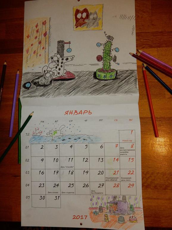 Всего календарей три вида: настольный календарь, Котокалендарь с кошачьими приметами и календарь-раскраска (большие календари - с забавными праздниками, такими как День Эскимо, День внезапной доброты и др.).