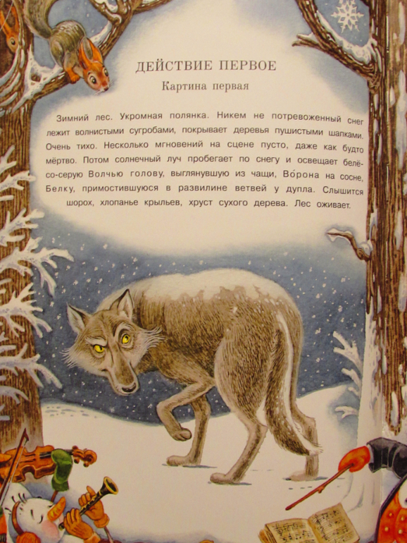 Максим Митрофанов на каждом развороте изобразил деревянную сцену и театральный занавес. Это выглядит как рамочки. Но необычно. От страницы к странице цвет занавеса меняется.
