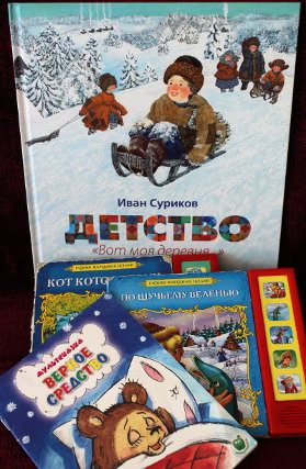 "По щучьему веленью" и "Кот Котофеич" - музыкальные книги. Они у дочки вдвоём неразделимы, да и с дочкой были первые дни совершенно неразлучны. Она включала фразы и песенки и "читала" сама.