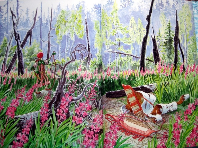 Поспорили и притихли. Настал солнечный день. Уголь и брусника ушли на охоту, берёста осталась в чуме, чтобы дождаться дождливой поры.