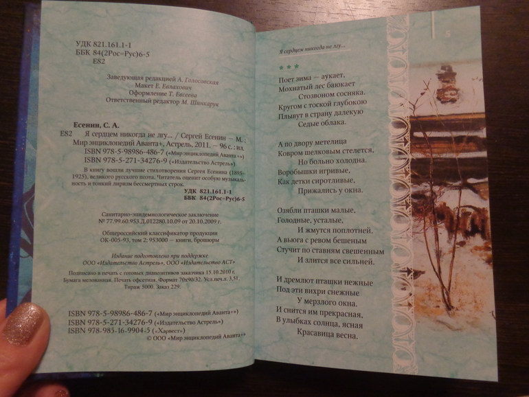 Заметила в книге только 1 опечатку в оглавлении. Моё счастье было бы наиполнейшим, если бы к стихотворениям указывался год их написания (но не гордая, могу и сама покопаться)), была бы кратенькая биография поэта и имя художника (художников)..хотя, конечно, сборник бы значительно вышел за пределы 96 страничек)))