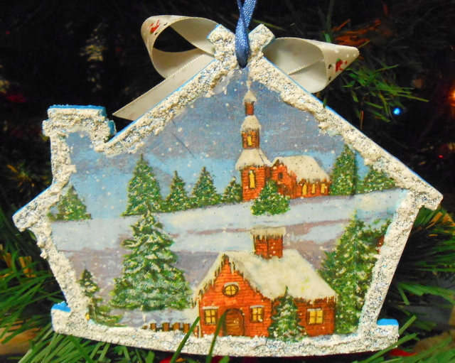 2. Второй дом - ёлочная игрушка, которую я сделала своими руками пару лет назад в технике декупаж. (на фото обе стороны дома) Чудесный домик, зимний, запорошенный снегом, от которого веет новогодним настроением. Скоро мы его достанем с антресоли и будем им любоваться все новогодние праздники.