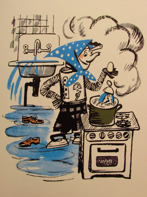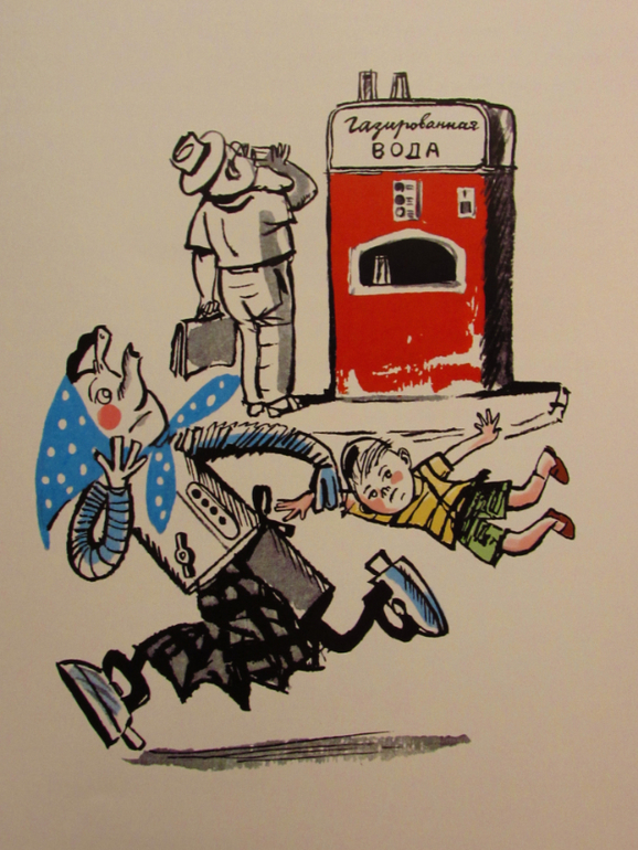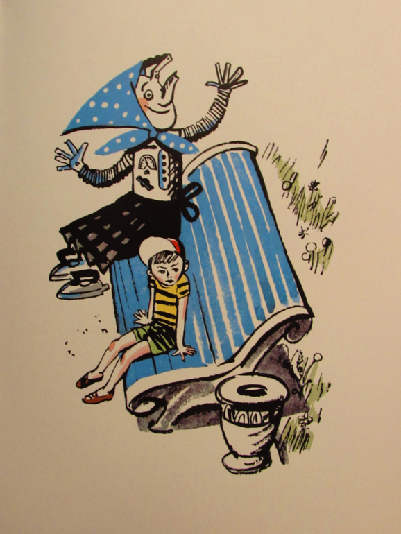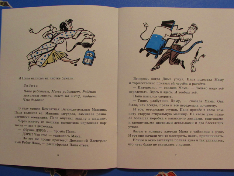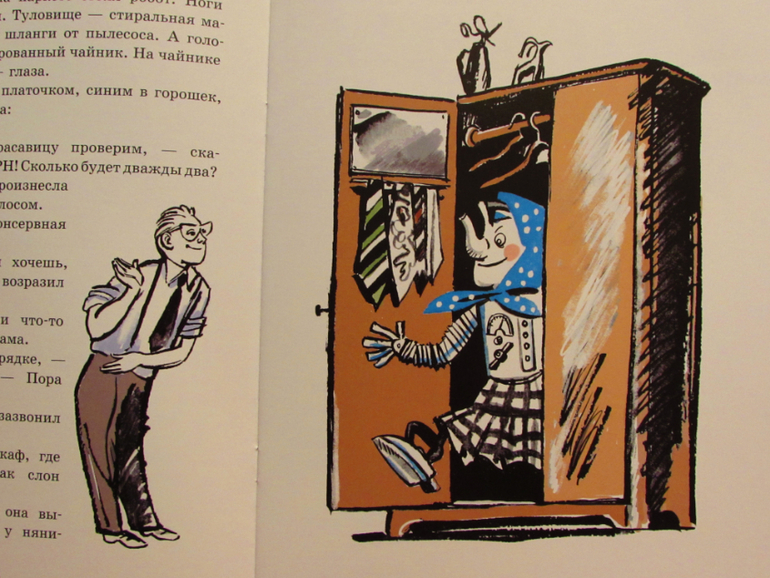 «Посередине комнаты на паркете стоял робот. Ноги у него были - электроутюги. Туловище - стиральная машина с дверцей. Руки - шланги от пылесоса. А голова - новёхонький никелированный чайник. На чайнике светились две лампочки - глаза.