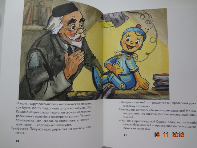 По сюжету сначала книга напомнила Буратино. Жил-был ученый профессор по имени Пилукка и не было у него детей. И вот решил он сделать себе железного сына Кьодино. А дальше начинаются настоящие приключения в лучших традициях "Гигантской груши") Сюжет пересказывать бессмыленно, но скажу по секрету, что Кьодино ждут настоящие испытания: помочь отцу заработать денег, спасти его из тюрьмы, найти настоящих друзей, научиться быть защитником, добрым и верным товарищем и сыном, спасти девочку Перлину и впоследствии быть спасенным ею от смерти.