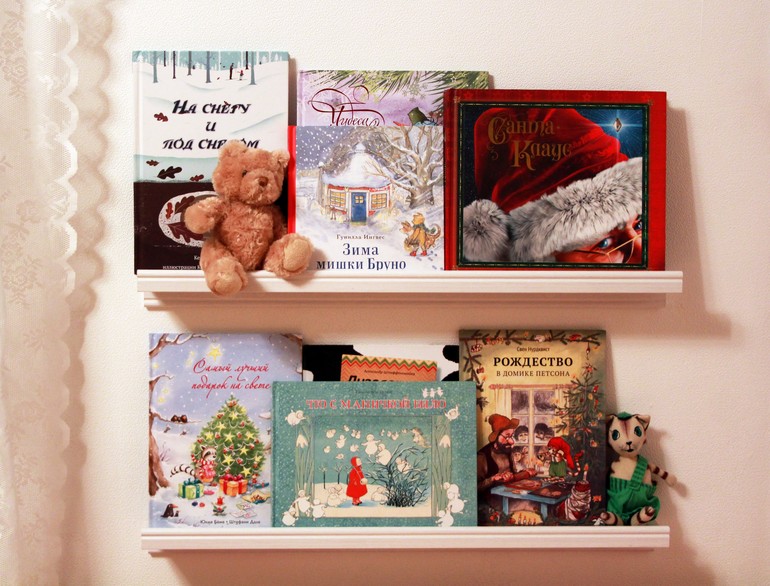 Поздравляю! Сама прыгала, когда наши полки вешали. В этом году хоть повод именно тематическое выставить. Полки у нас высоко весят, но и ребёнок не низкий, до нижней с кровати достаёт (получается, что в ногах полки висят), с верхней просит. Чисто новогодние книги ещё не ставила.