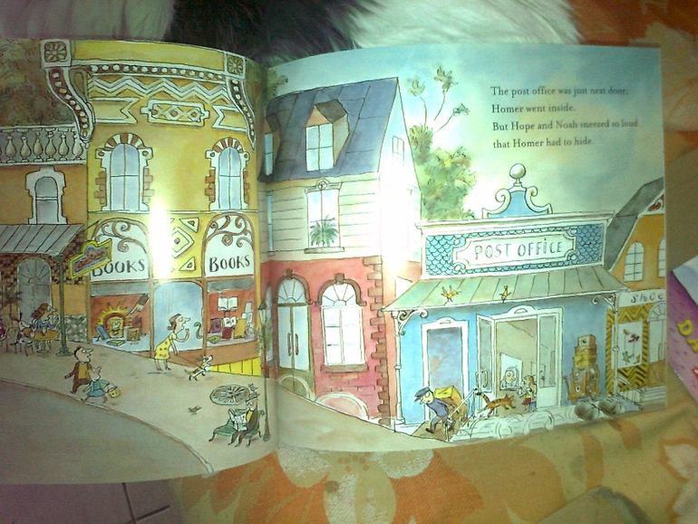 Первой к нам пришла книга про библиотечного кота. Милый рассказ про домашнего кота Хомера, который пустился в путешествие по городу и пока не дошел до места работы своей хозяйки-библиотекаря. Вот несколько разворотов.