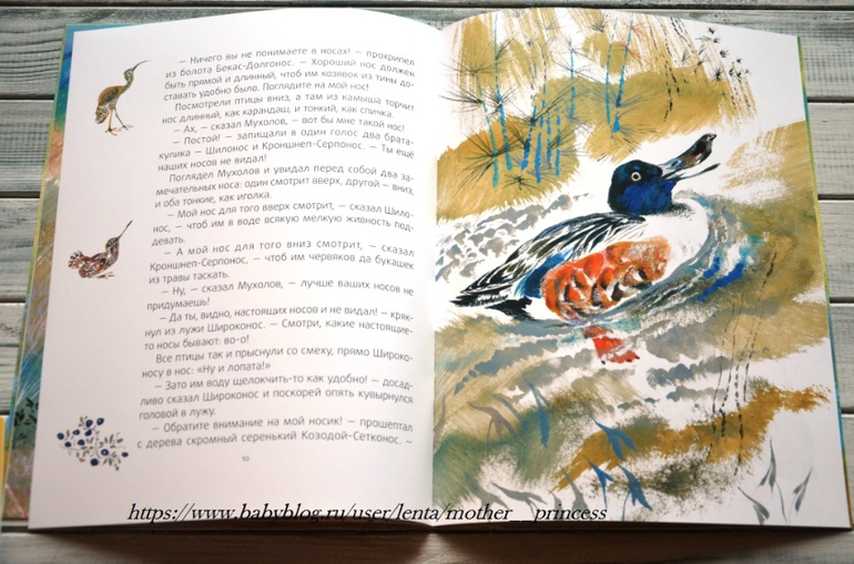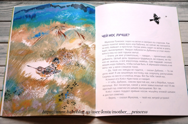 Истории в книге "Чей нос лучше?" познакомят ребёнка не просто с клестом или дятлом, а Клестом-Крестоносом, Дятлом-Дубоносом, Мухоловом-Тонконосом, Шилоносом и Кроншнепом-Серпоносом, Козодоем-Сетноносом. Есть о чём поговорить, кого вообразить и после нарисовать.