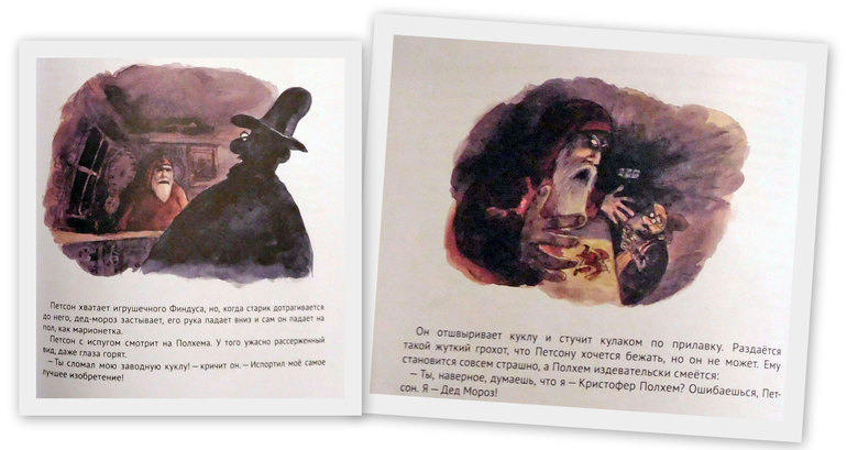 Лично мне понравилась сама тема сказки, её завязка: Финдус хочет увидеть Деда Мороза. Петсон переживает, что если котёнок не увидит сказочного новогоднего гостя, то сильно расстроится. Поэтому Петсон решает смастерить механического Деда Мороза… Такое начало дает замечательный повод обсудить с ребенком множество вопросов: хорошо ли поступает Петсон, ведь он собирается обмануть котика, но в то же время хочет исполнить мечту Финдуса, хочет его порадовать…