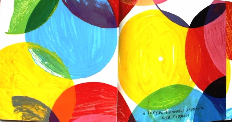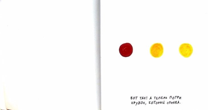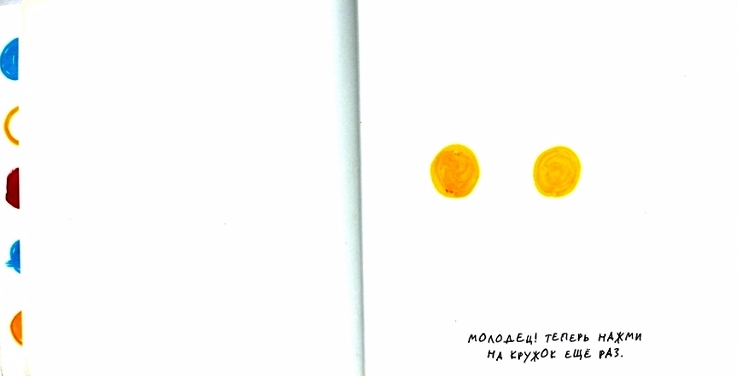 Автор, мне кажется, какие-то грибы кушает, когда придумывает свои книги. Ну как можно придумать страницу с кружочком и надписью «Нажми на него»?! А сколько в этой простоте гениальности! Ребенок как завороженный переворачивает каждую страницу, и раз от разу удивляется волшебству. А мамочка радуется и дитячей радости, и, главное, пресловутой мелкой моторике, под эгидой которой проходят несколько лет в продвинутых семьях.