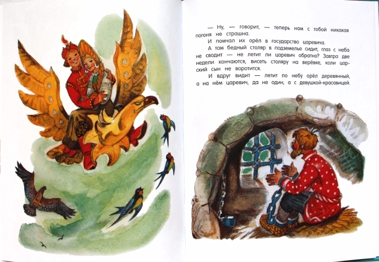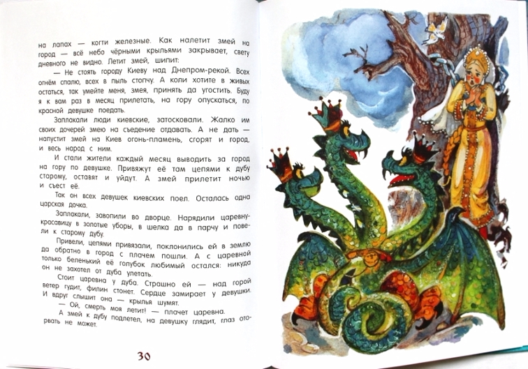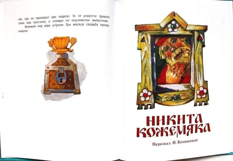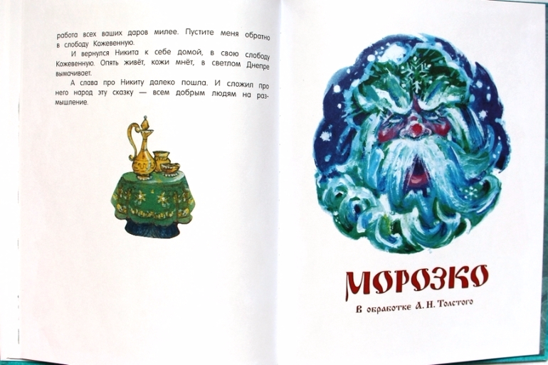 В книге три сказки: Деревянный орел (пересказ Н. Колпаковой), Никита Кожемяка (она же) и Морозко (в обработке А.Н. Толстого). Сказки прекрасны! Мой младшенький видно тоже ими заинтересовался - радостно тычет пальцами в царя, может думает, что это дед мороз.)))