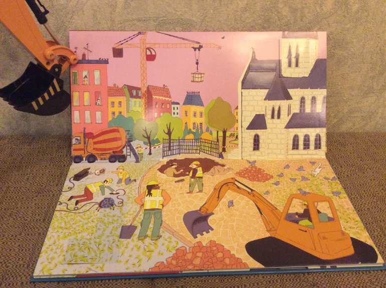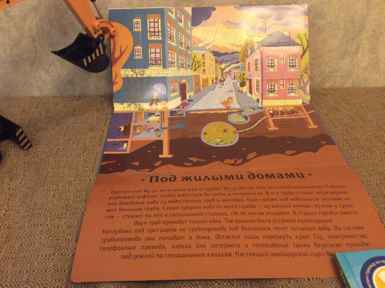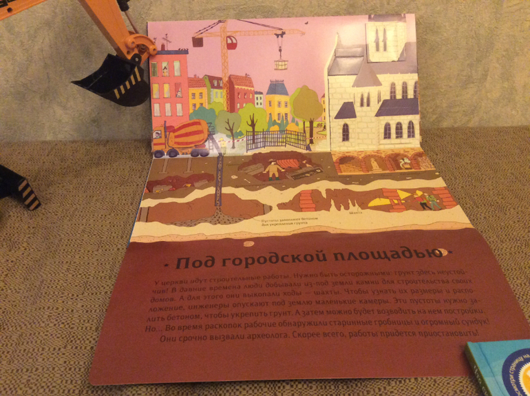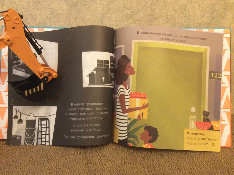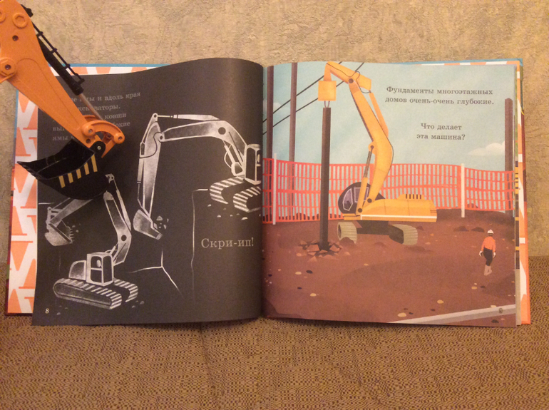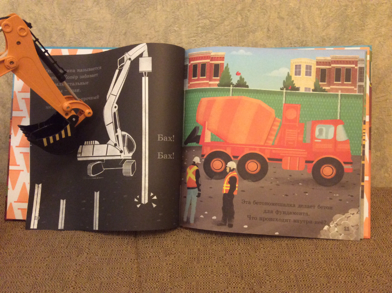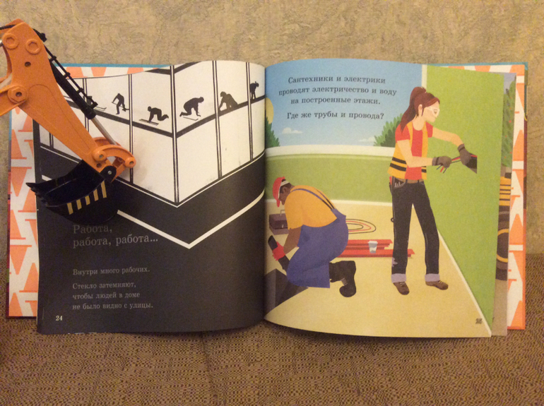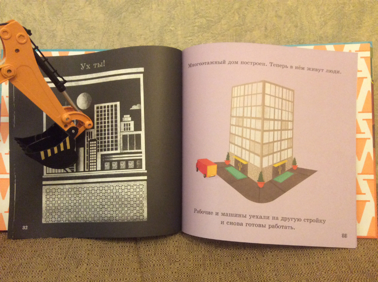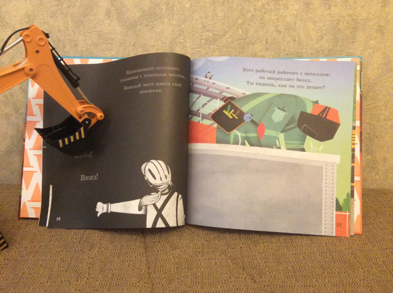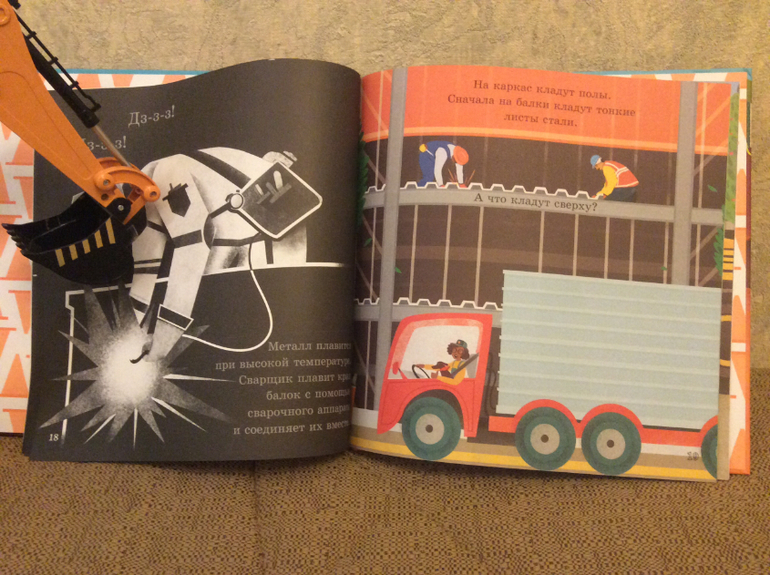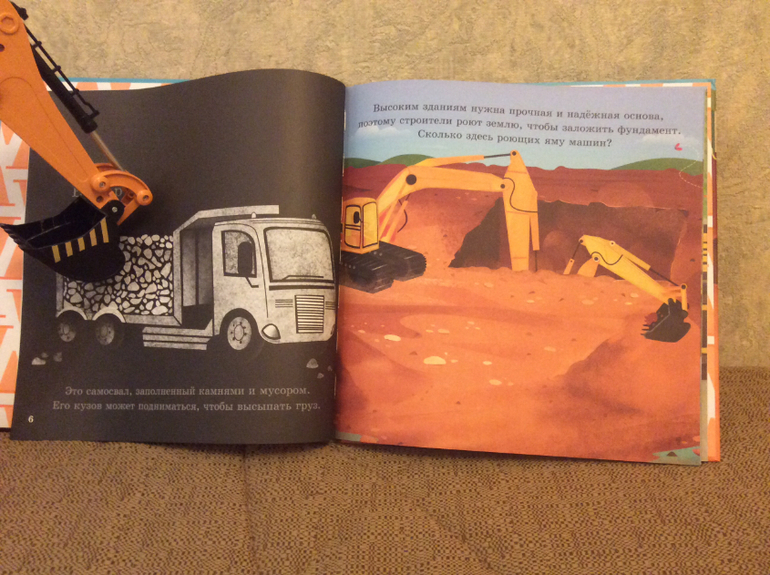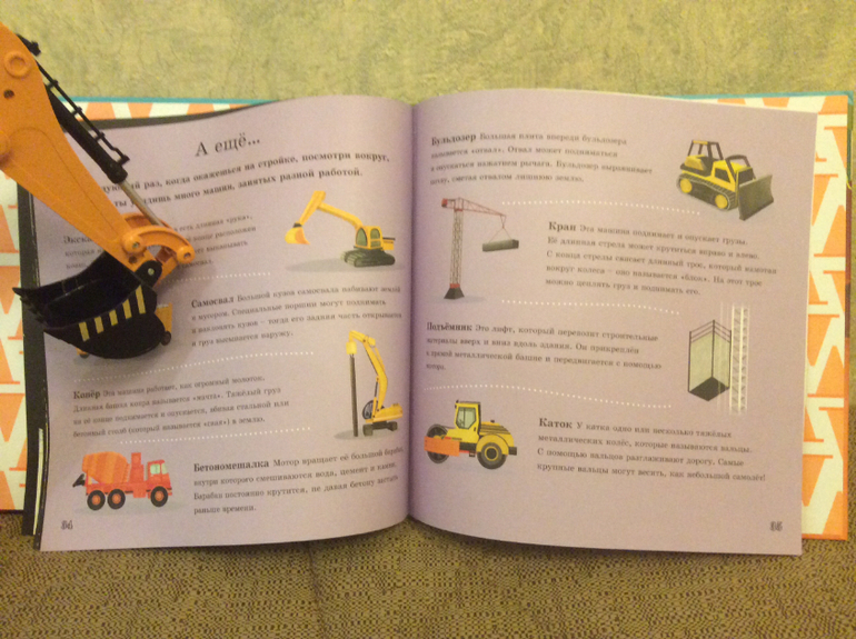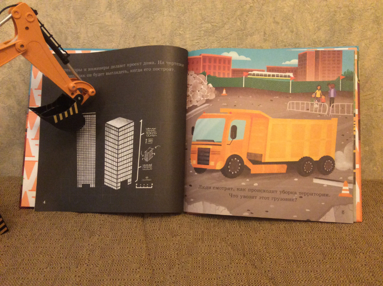 Да я сама много нового из этой книжки узнала, как закрепляют стекло, например. Или как называется машина, которая сваи вбивает. Ведь если хочешь быть своему ребёнку другом, надо уметь разделять его увлечения)