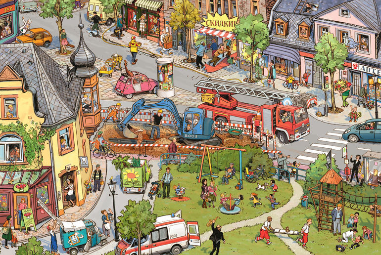 Так же на каждой странице есть окошки с секретами. Можнозаглянуть и посмотреть, что скрывает фантан, что происходит внутри кафе. Как на стройке специальными камерами поверяют ситуацию под землёйс