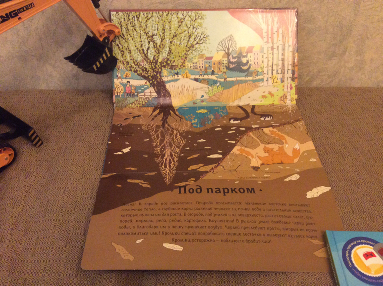 Фоормат книги просто замечательный. По размеру она небольшая, но сделана как раскладушка. То есть вначале видно, что происходит над землей, а потом мож заглянуть во внутрь.