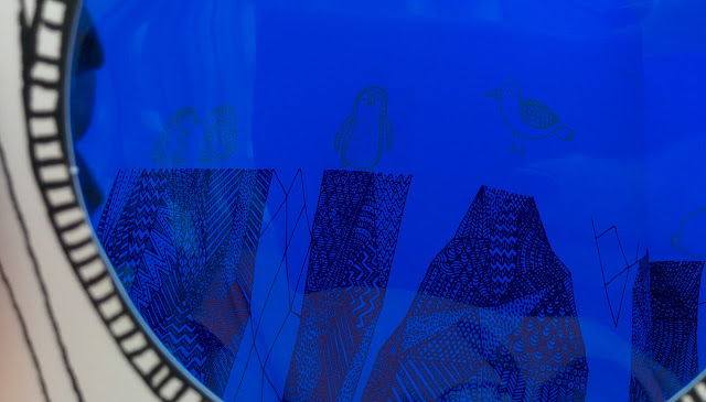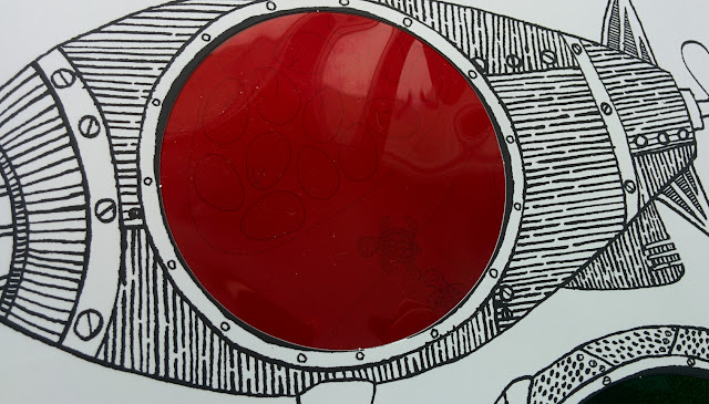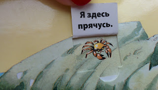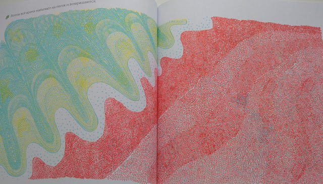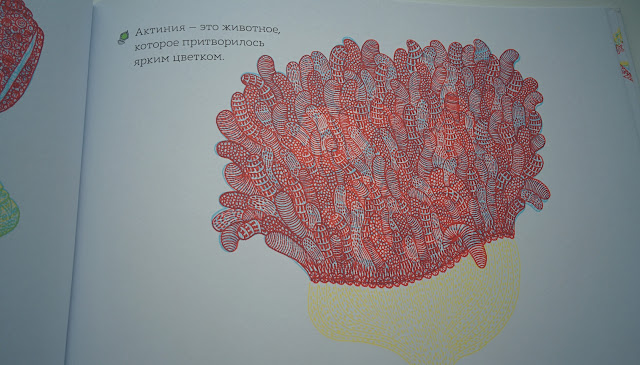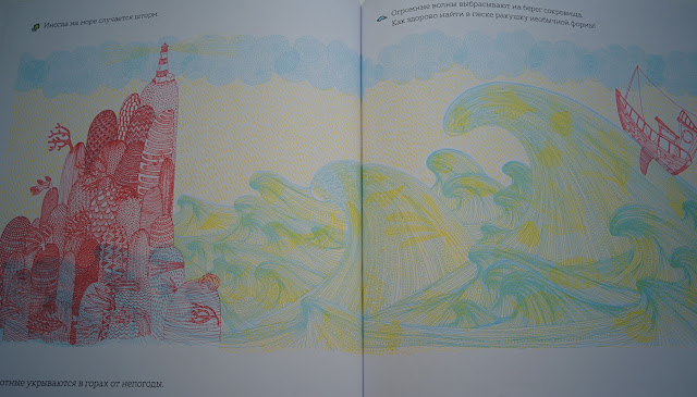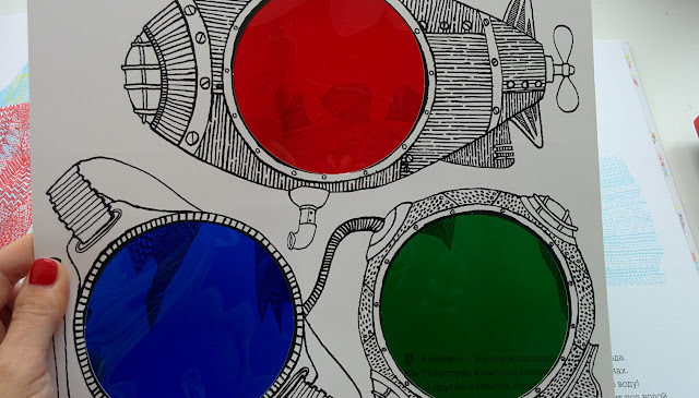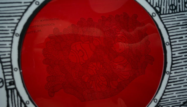 По задумке автора мы смотрим сквозь шлем водолаза (зеленый), маску для ныряния (синий), иллюминатор батискафа (красный). В зависимости от цвета на одной и той же странице мы увидим совершенно разные картинки! То птичек на берегу, то рябь волн, то бурную жизнь на глубине... И таких сюжетов для исследования в книге 11! Корабли, айсберги, ракушки и водоросли, причудливые рыбы и черепашки... На фото или видео сложно передать, но вживую все метаморфозы очень четкие и интересно смотреть именно на преображение картинки целиком!