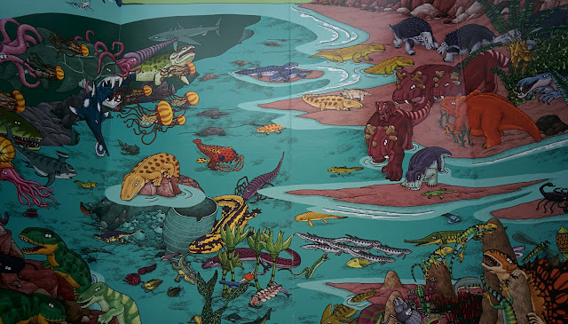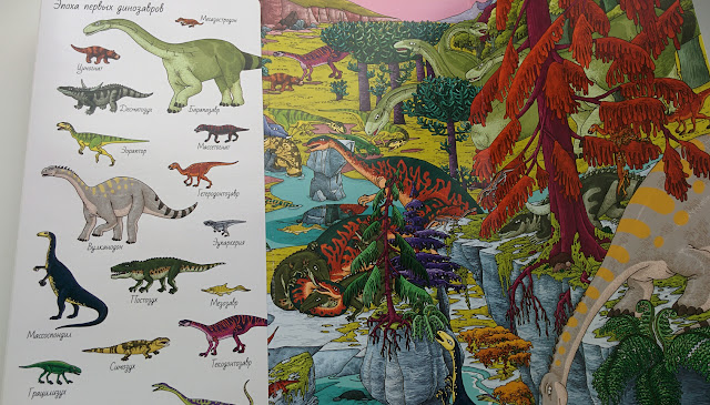 Как обычно, все развороты выполнены в виде раскладушки. Сначала можно посмотреть на динозавров и запомнить их имена, а потом раскрыть створки и поискать их на общей панораме.