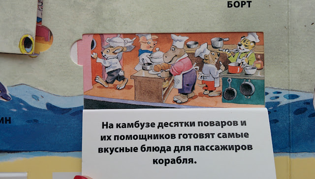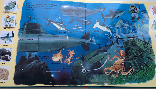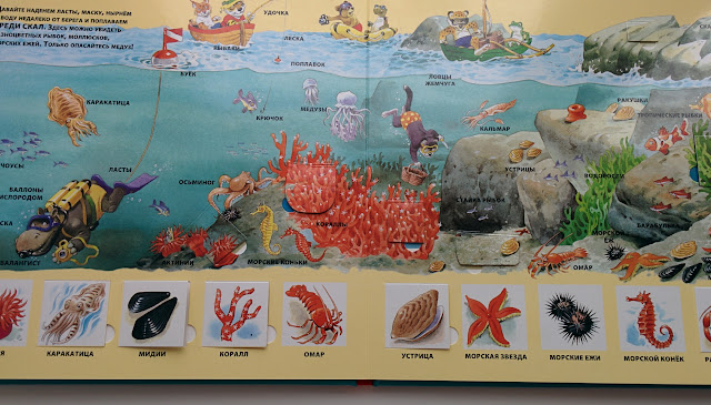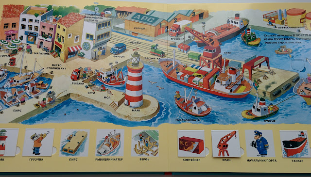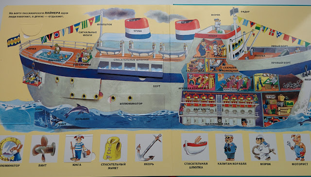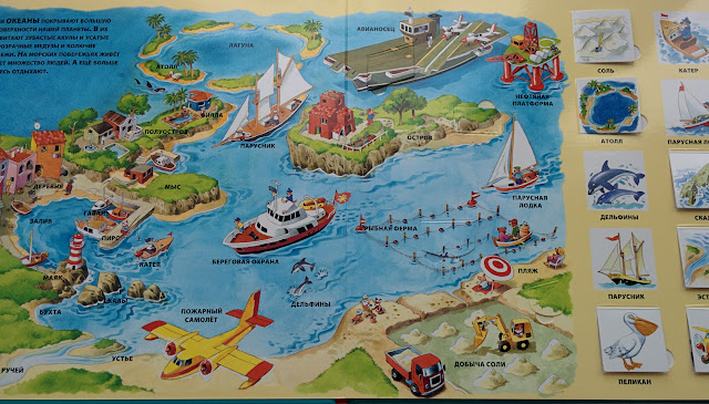 Всего в книге 6 разворотов, которые знакомят с жизнью у моря, под водой, в порту, на корабле.