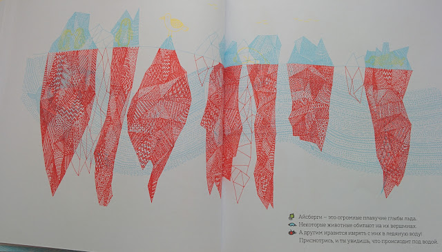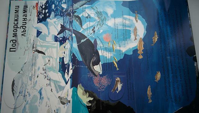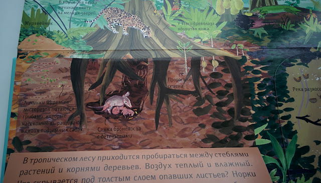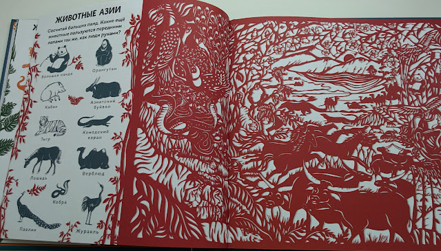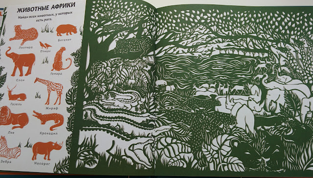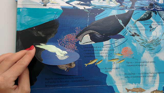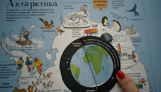 Всего в книге 5 локаций и куча сюрпризов: Окошки, раскрывашки, очень красивые иллюстрации (особенно мне нравится Северный полюс и Тропический лес).