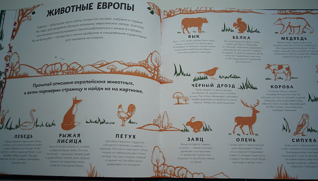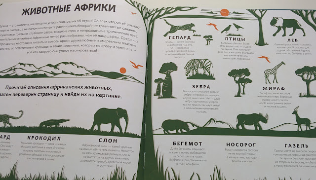 Животные Африки, Азии, Европы, Арктики и Антарктики, Северной Америки, Южной Америки и Австралии - вначале разворот с коротким описанием, а затем - картинка для разглядывания и поиска замаскировавшихся животных.