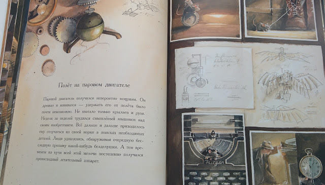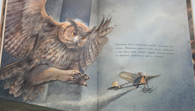 Очень красивая книга, конечно, фотографиями это не передать. Рассказывает о мышонке, который оказался в опасности. Ему угрожали люди, коты и совы, но зверек не растерялся и стал изобретать летательный аппарат, чтобы пересечь океан. Затея удалась не с первого раза, но мышонок не сдавался и в конце концов у него все получилось! Текста в книге не очень много, а иллюстрации просто дивные! Недавно вышло своеобразное продолжение Линдберга про мышонка, который решил полететь на Луну... Все думаю, нужна ли она нам. С одной стороны, оформление сказочное, с другой - получится уже две однотипные книги. В общем, пока не решилась на покупку.
