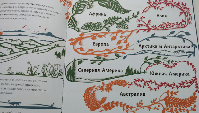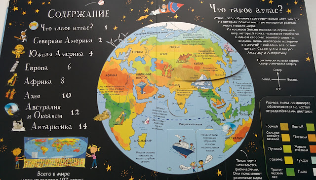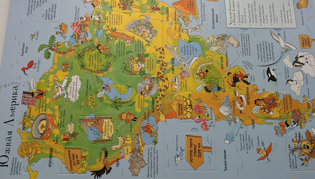 Под каждый материк - отдельный разворот с окошками и вынесенными в рамочку интересными фактами.