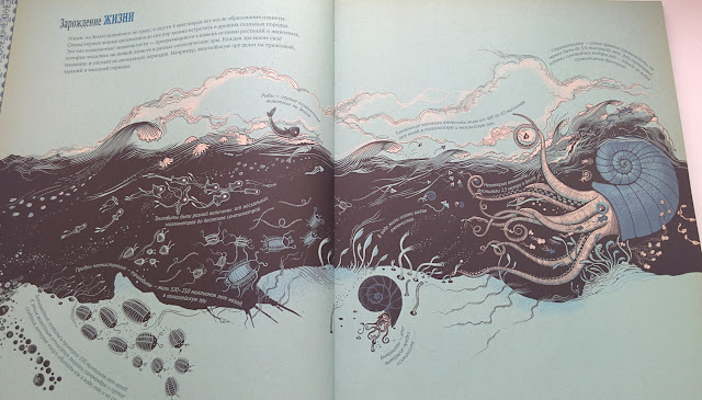 Информации очень много, мы с мужем с удовольствием рассматривали книгу. Конечно, все события описаны кратко, но наглядно, можно четко проследить, что и когда происходило, что было вначале, а что после, все развороты оформлены в единой стилистике, события размещены на черной ленте времени, которая началась от Большого взрыва, а в конце (в наши дни) ее продолжают дорисовывать.