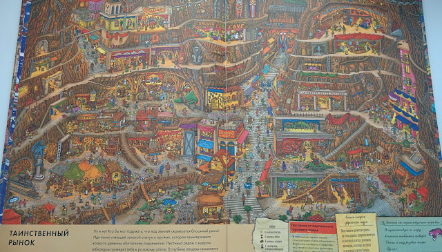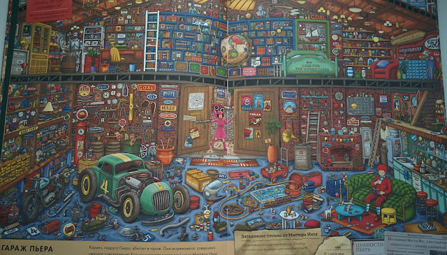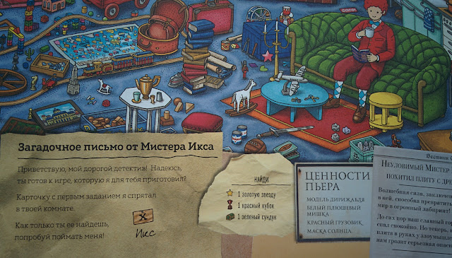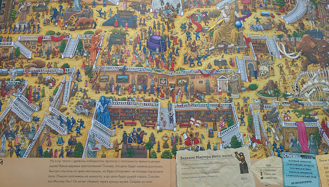 Точно могу сказать, что в детстве я бы сошла с ума от счастья, да и сейчас от книги в большом восторге! По сути это виммельбух, но для детей постарше, думаю, уже для младших школьников, хотя я читала в отзывах, что и 5 летние стараются, пыхтят. Влад полноценно до лабиринтов и заданий пока не дорос, но любит искать мистера X. Так что пока книгой в полной мере наслаждаюсь я