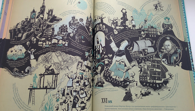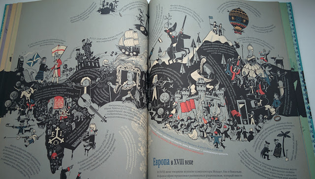 Жаль только, что истории России посвящено мало, в основном упор на Европу, интересно было бы подробнее! Формат необычен, но не шуточный, не забавный, информация преподнесена серьезно, есть над чем подумать и о чем поговорить. На сайте издательства можно скачать вопросы и задания для обсуждения с ребенком. В общем, такой виммельбух для взрослых