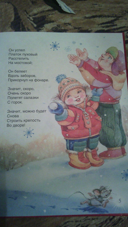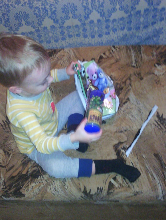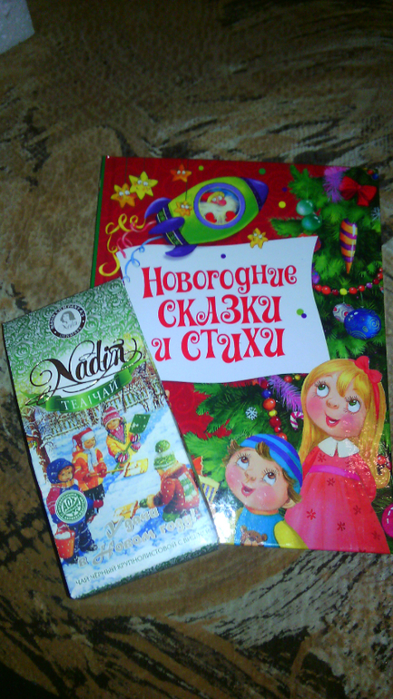 Затем показались чай и новогодняя книжка. Чай мы пока не пробовали (но Егор его тоже открыл, ножницы же под боком), а книжка чудесная. Мы в ней даже нашли наши стихи, которые выучили для утренника.