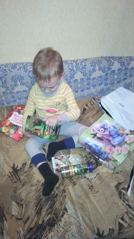 Обычно мы все посылки открываем вечером, когда папа приходит с работы. В этот раз Егор ждать никак не хотел, взял свои новые ножницы и усердно пытался ее открыть самостоятельно (Сразу предупреждаю и извиняюсь, фотографии не четкие, потому что Егорушка не мог сидеть спокойно).