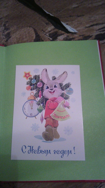 а еще мы в ней нашли открытку с добрыми пожеланиями. Помню, когда учились в школе, для украшения зала объявлялся конкурс новогодних картин. Мы всегда перерисовывали на больших ватманах открытки Зарубина. Как-то рисовали со старшей сестрой и этого зайчика.