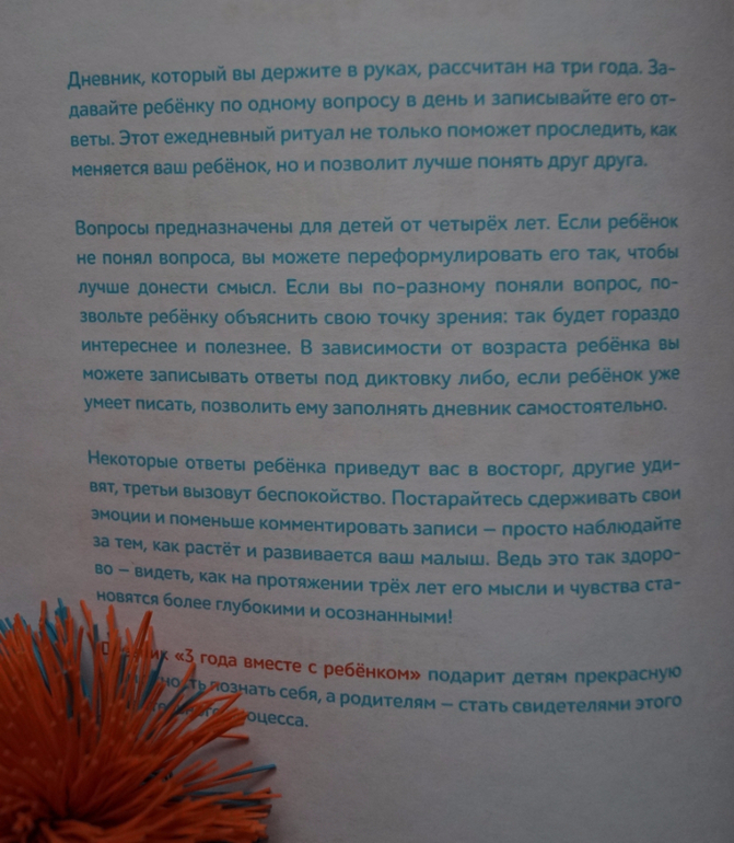 С 1 января 2017 года мы с Алисией начнем вести интересный дневник. 3 года вместе с ребенком. 365 вопросов * 1095 бесед. Каждый день ей нужно будет ответить на один вопрос. А мне нужно будет записать ответ. На следующий год все повторится. И так три года подряд. Повторятся 365 вопросов. Но ответы ребенка, повзрослевшего на год, будут другие. Или такие же? Я уверена, что записи, которыми наполниться этот небольшой томик, будут бесценными.
