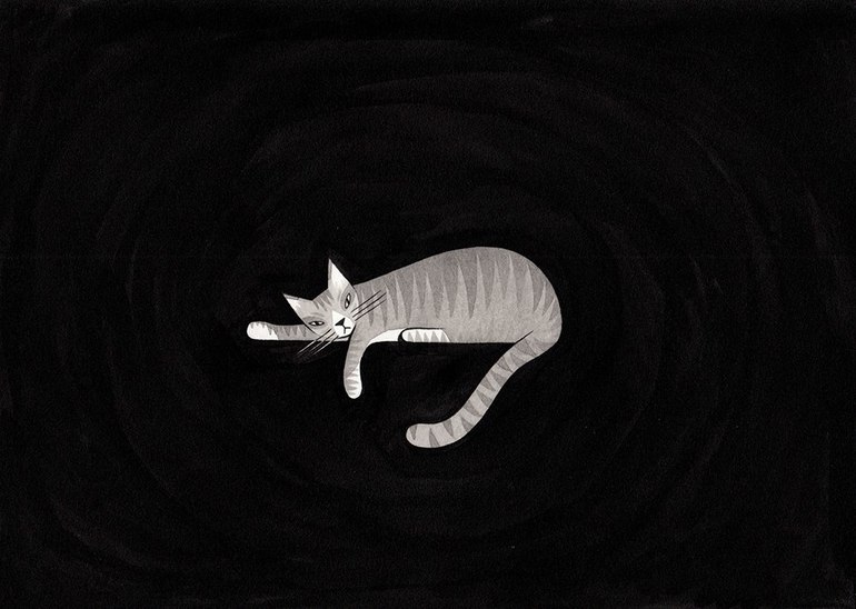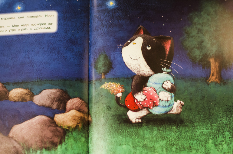 А это задумчивый и довольный котенок Нори возвращается домой с целой кучей засыпательных подарков.