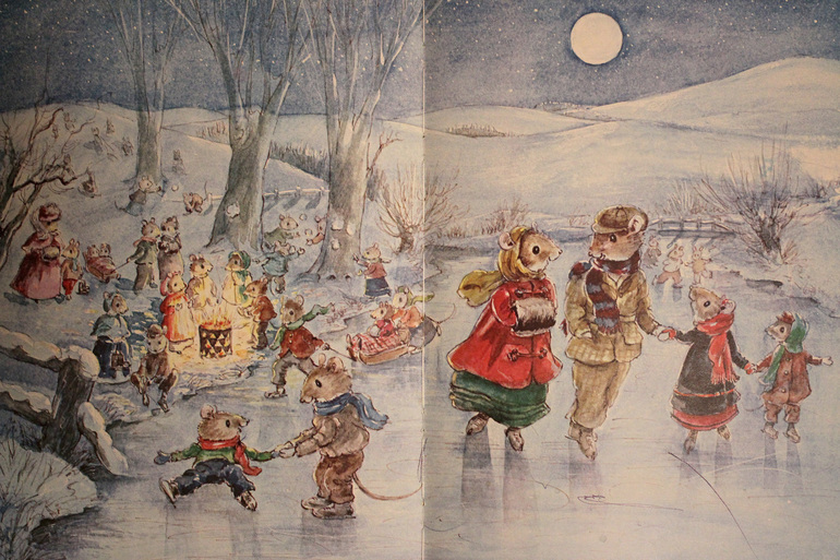 Росла я в местности, где никогда не бывало снега, поэтому в детстве этот зимний мышиный праздник мне казался особенно волшебным. Как весело было б вместо того, чтобы ложиться вечером спать, кататься на коньках при лунном свете и греться у костра!