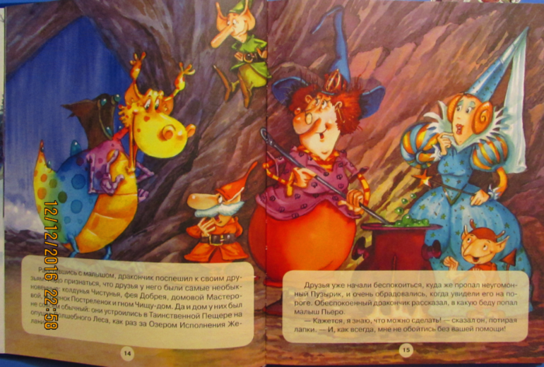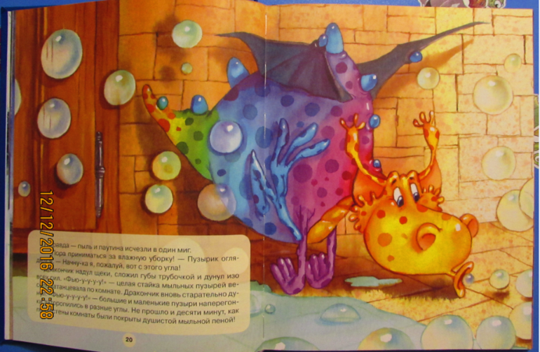 Имена друзей Пузырика очень забавные: гном Чищу-дом, домовой Мастеровой, колдунья Чистюнья, фея Добрея, чертёнок Пострелёнок.