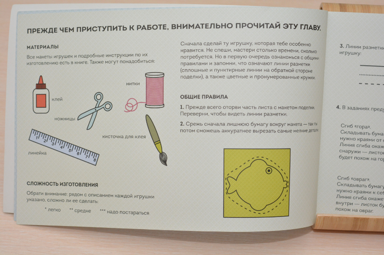 На каждой странице есть инструкция по изготовлению конкретной игрушки, та часть страницы, где находятся детали для изготовления, имеет перфорацию, т.е. ребёнок всё легко, просто и самостоятельно может оторвать.
