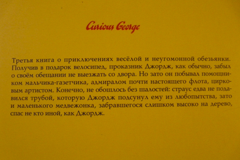 Любопытный Джордж -это обезьянка,с которой происходят различные приключения. Качество очень понравилось, страницы очень плотные, выпускает эту книгу издательство "Розовый жираф".Иллюстрации на каждой странице. Всего в серии про любопытного Джорджа выпущено 6 книг.