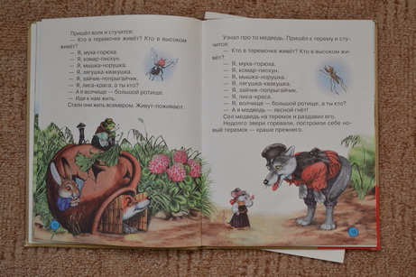 Не могу сказать, что народные сказки у нас в почёте. Слушать слушает, но сама приносит редко. Самой любимой была и остаётся "Курочка ряба". Где-то в 1,8 начала полностью слушать "Репку" и "Колобка". Ещё позже добавился "Теремок", вызвавший достаточно бурный интерес. Надо отметить, что первого своего "Колобка" от изд.Алтей мы потеряли и довольно долго не могли найти. Ему на смену был куплен "Колобок" от изд. Облака, который полюбился дочери гораздо больше.