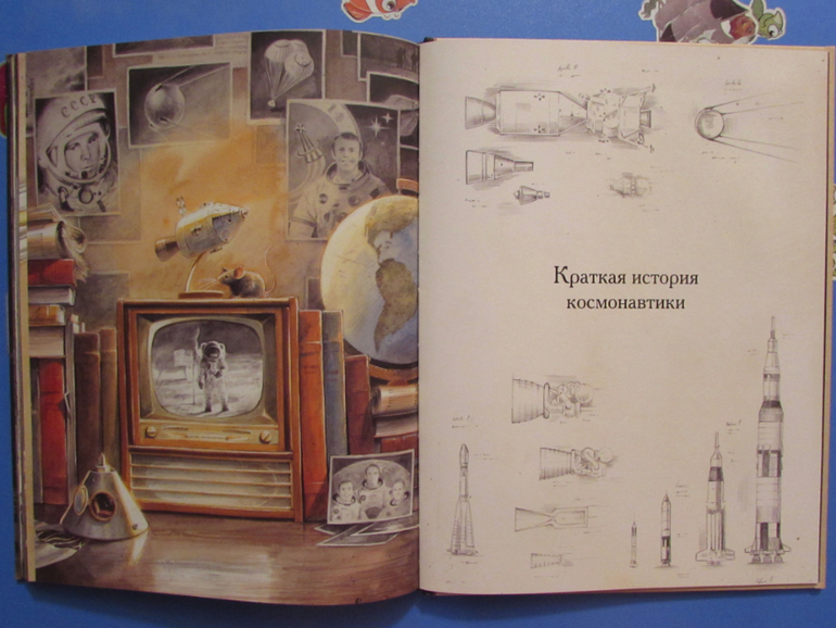В конце приведена краткая история космонавтики, из которой ребёнок узнает о Галилео Галилее, Константине Циолковском, Ниле Армстронге и других.